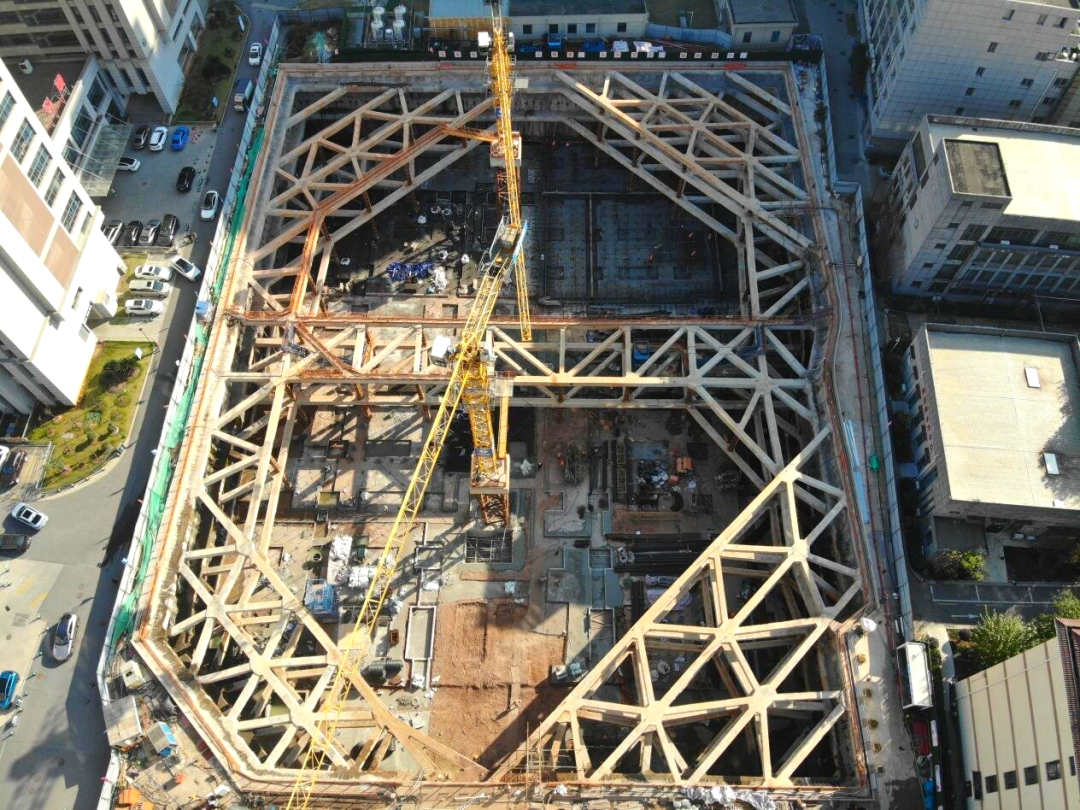 創(chuàng)新采用“旋挖樁+三層混凝土內(nèi)支撐”的復(fù)合支護(hù)體系。基坑平面尺寸達(dá)105.2米×81.9米,深度13.3—15.05米,設(shè)置支護(hù)樁279根、鋼立柱54根及三層混凝土內(nèi)支撐。針對(duì)雜填土區(qū)域富含地下水的情況,項(xiàng)目在支護(hù)樁間增設(shè)214根高壓旋噴樁,構(gòu)筑起一道可靠的截水帷幕,有效防止了基坑邊水土流失,保障了基坑穩(wěn)定與周邊建筑物安全。