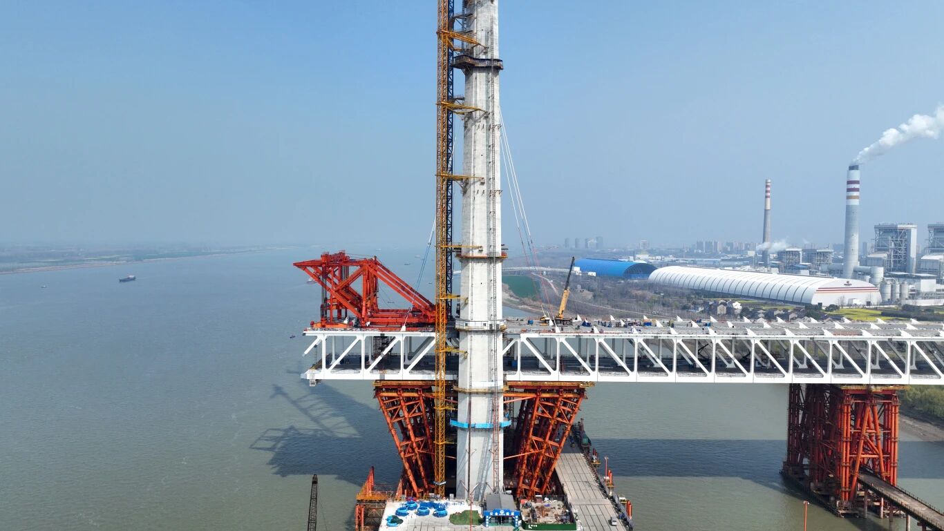 截至目前,池州長江公鐵大橋南岸第22節(jié)段鋼梁已順利完成吊裝拼接工作。南岸主塔塔柱272.7米全部完成。南引橋鐵路墩身全部完成,正在進行上部結(jié)構(gòu)施工,已完成26片鐵路梁施工,公路連續(xù)梁施工已完成16節(jié)段。