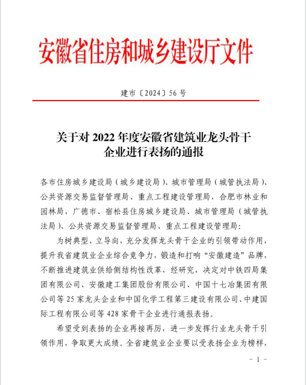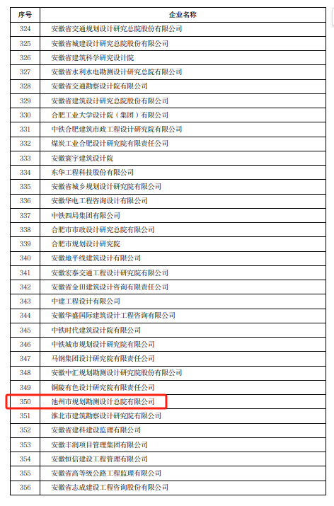 4月10日,安徽省住房和城鄉(xiāng)建設(shè)廳發(fā)布了《關(guān)于對2022年度安徽省建筑業(yè)龍頭骨干企業(yè)進(jìn)行表揚(yáng)的通報》,集團(tuán)所屬池州市規(guī)劃勘測設(shè)計總院有限公司榮登榜單。